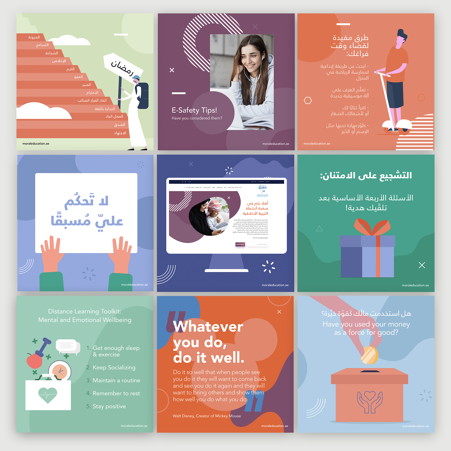 Pulling the Moral Education curriculum out of the classroom and plunging it into the world of social media, this project aimed to capture the attention of a younger audience – students. With a curriculum stretching over grades 1-12, core concepts were carefully selected and adapted to suit students of all ages. Content included quick tips, advice, uplifting quotes, activity ideas, thought provoking questions, and interactive animated posts for increased engagement. While the topics of morals and ethics can often feel serious, we used a joyful, eye-catching palette coupled with fluid shapes, accent graphics and soft imagery to create a playful look and feel.