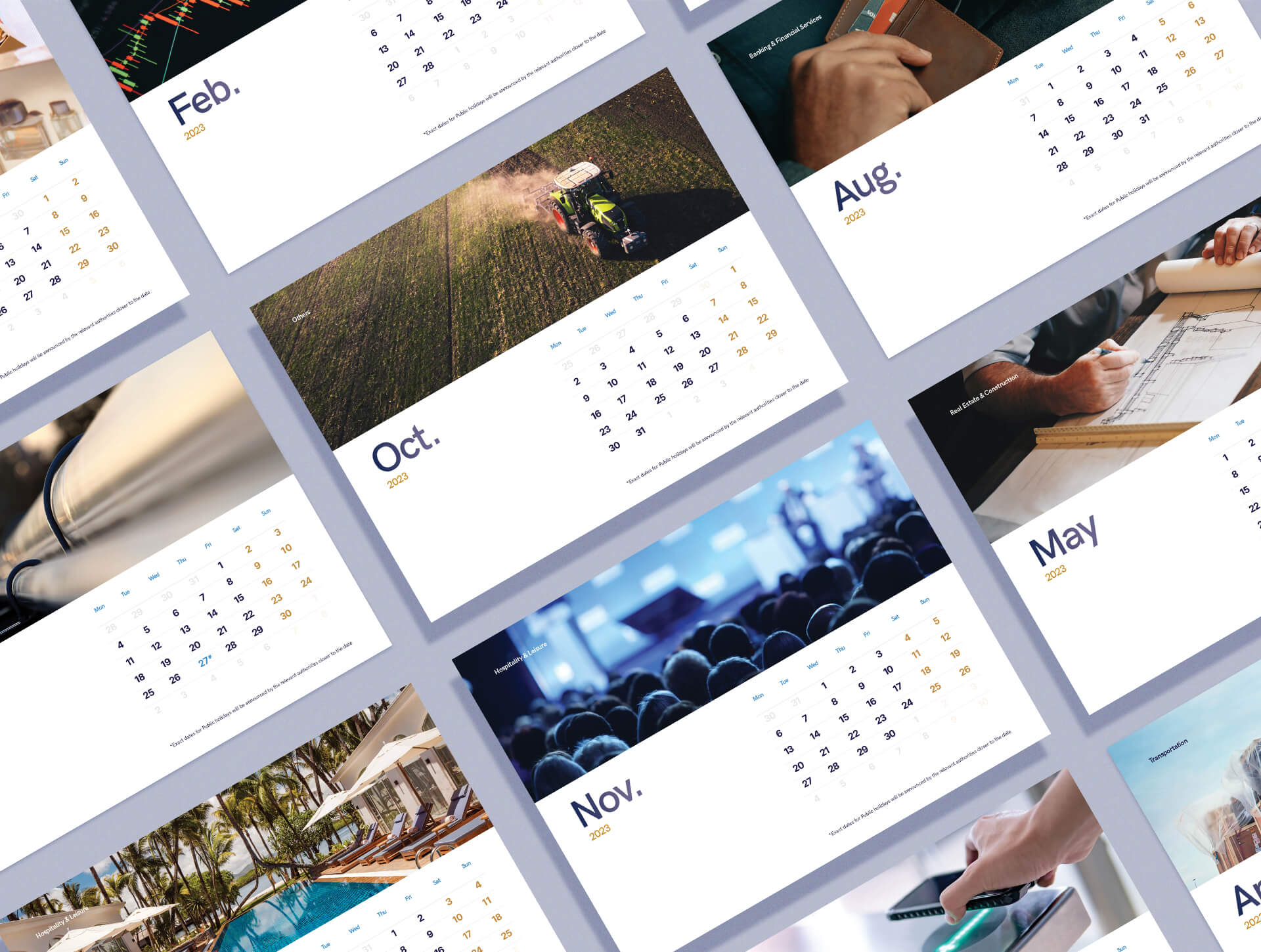 Our client is jumping into 2023 stronger than ever, with business booming and their investments thriving. To capture this, the calendar highlights each of their portfolio industries, casting a spotlight on their varied subsidiaries and capturing the breadth of their impact and success. Clean and polished images capture attention, and are juxtaposed with ample white space, sleek text, and minimal noise for a balanced and serene look & feel.